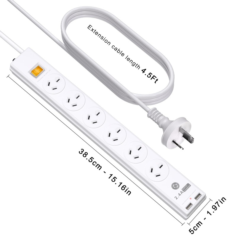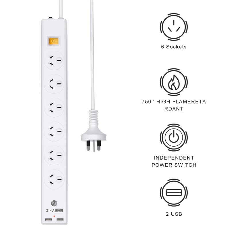 - 【Power strip with USB Ports】6 AC outlets (240V/10A) and 2 USB ports, this USB power strip can charge up to 8 devices simultaneously.