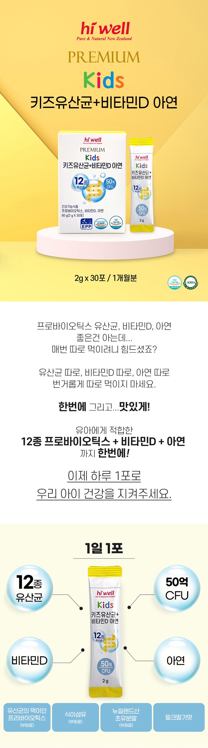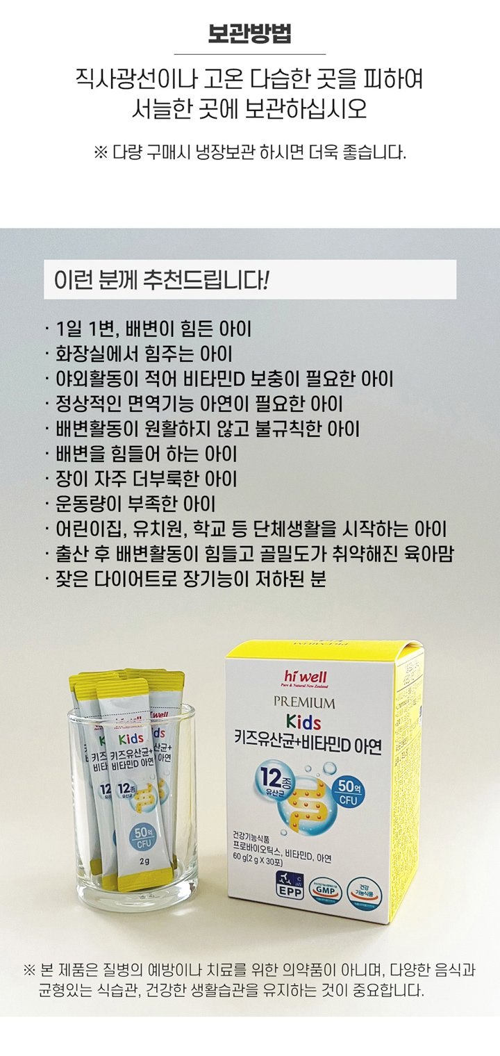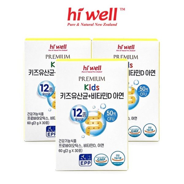 Hiwell 프리미엄 키즈 유산균 비타민D 아연 30포 3통 Premium Kids Probiotics Vitamin D Zinc 30 Pack 3 Bottles