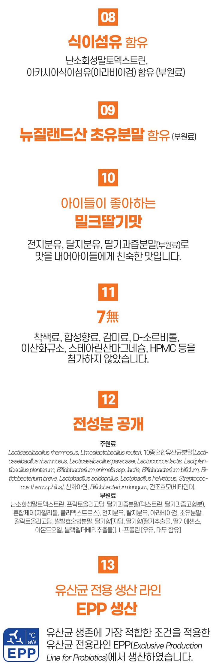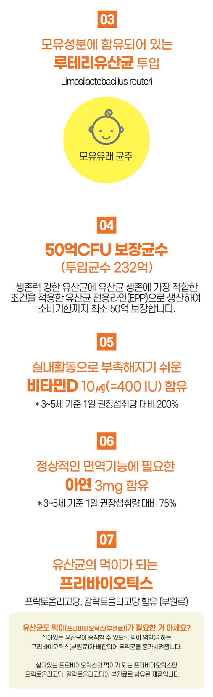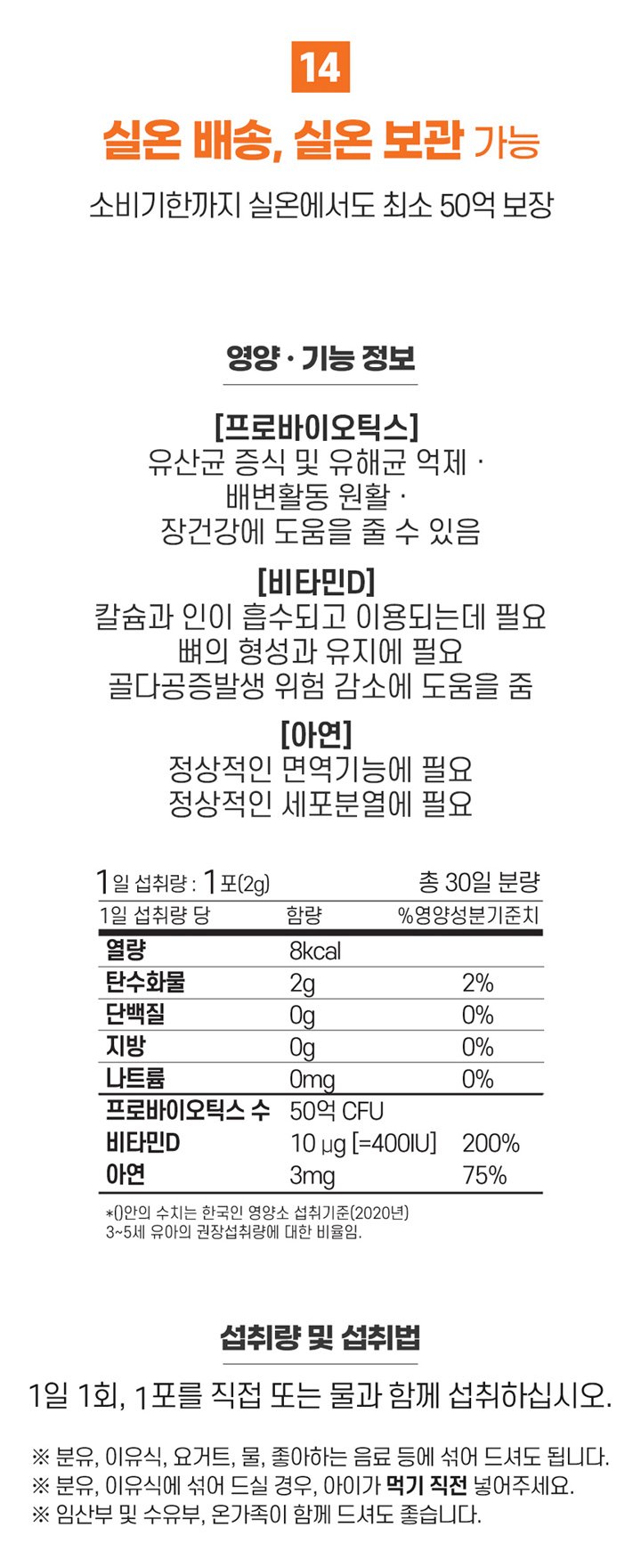 - Nutritional Information: Daily Intake: 1 packet (2g) per day / Content per daily intake: Calories 8kcal, Carbohydrates 2g (2%), Protein 0g (0%), Fat 0g (0%), Sodium 0mg (0%) / Functional Components: Probiotics count 5 billion CFU, Vitamin D 10 µg (400 IU) (200%), Zinc 3mg (75%) (Values in parentheses are percentages based on the recommended nutrient intake for Korean children aged 3-5 years (2020).)