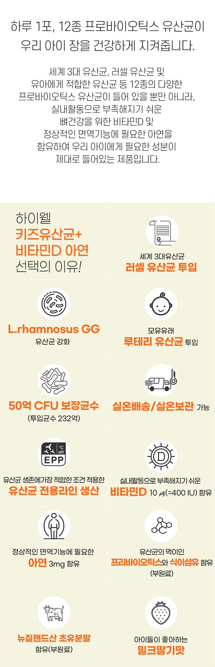 | Key Functional Components Per Daily Packet (2g) | Probiotics: 5 billion CFU Vitamin D: 10 µg (400 IU) - 200% of RNI* Zinc: 3mg - 75% of RNI* *Recommended Nutrient Intake for Korean children aged 3-5 years (2020) |