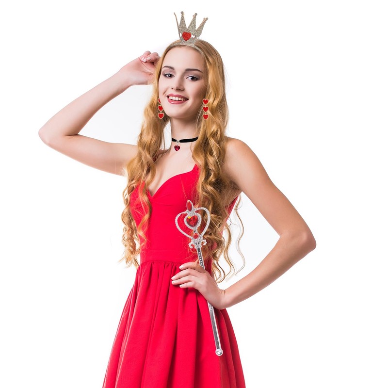 HIXNUG 4pcs Heart Queen Costume Accessories Gold Crown Headband Rhinestone Scepter Wand Red Heart Dangle Earrings Choker for World Book Day Cosplay Accessories