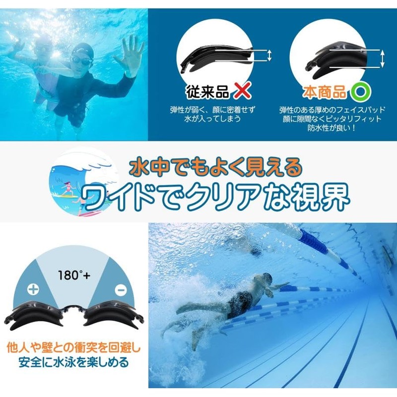4. Goggles are designed to reduce impact when entering water and reduce resistance. The small protrusions of the eyecup adjust the flow of water by suppressing the movement of the eyecup when jumping. Wider forward field of vision for increased visibility. Durable, lightweight, and fit goggles, suitable for both beginners and advanced swimmers.