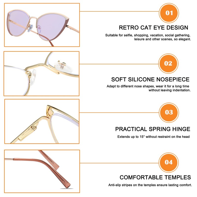 - RETRO CAT EYE DESIGN ► With electroplated gold cat-eye metal frame, it creates a super cute look and is timeless for ladies with different face shapes. Suitable for selfie, shopping, vacation, social gathering, leisure and other scenes, so elegant.