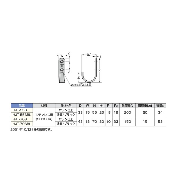 スガツネ工業 ランプ印 ステンレス鋼製フック HJT型 HJT-70S