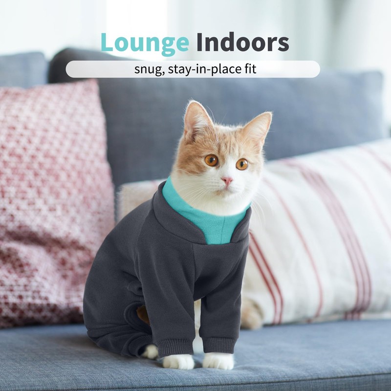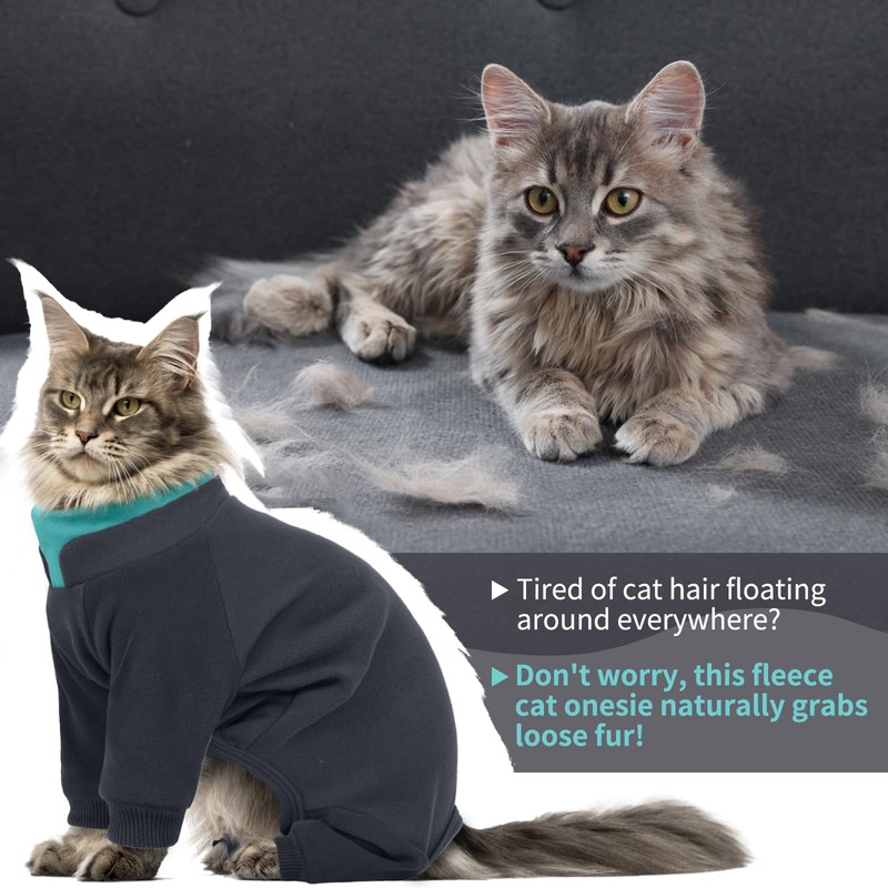 Hjumarayan Cat Onesie, Full Coverage Warm Fleece Jumper with Four-leg Sticky Hair Clothes, Soft Long Sleeve Cat Recovery Suit Stretchy Body Suit to Stop Licking, Grey L