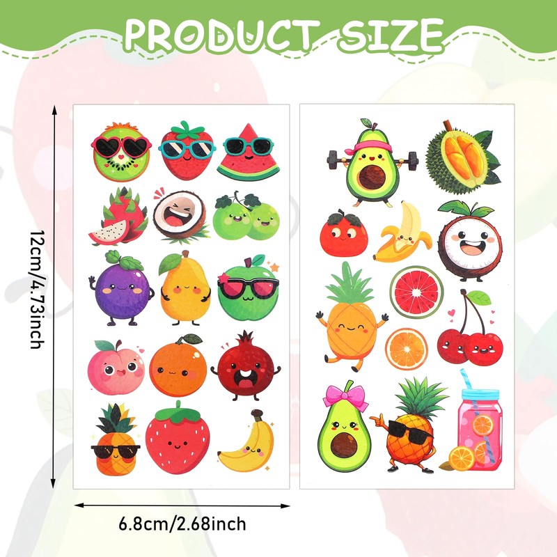 - 10 Sheets 96PCS in Total: The fake tattoo contains 10 fruit tattoo stickers, the size is 12×6.8cm/4.73×2.68 inches, a total of 96 pieces. It uses waterproof ink and is durable. You can have personalized tattoos painlessly. 96 pieces with different patterns, there are rich choices to meet your different preferences and needs, very suitable for fruit themes, parties, birthday activities, school rewards, etc., as well as as small gifts