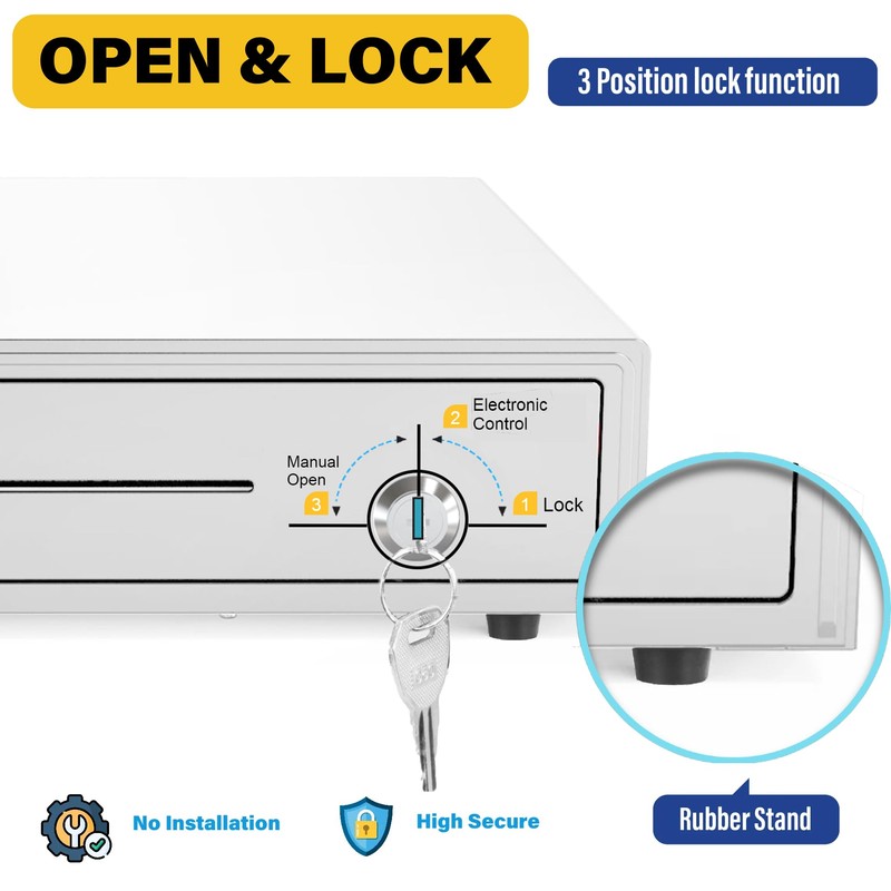 - 💳3-Position Lock& Single Large Front Media Slot: This cash drawer ensures the highest level of security with a 3-position lock mechanism: 1-Lock, 2-Auto Open by Printer/POS, 3-Manual open