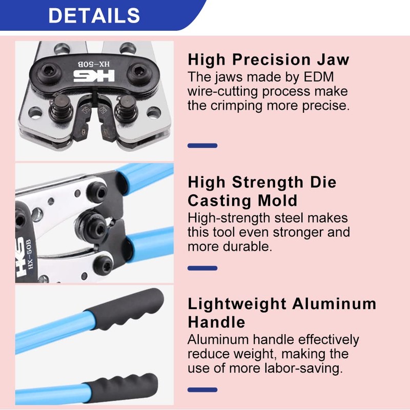 - 【Rotatable Crimp Jaw】 Secured by spring-loaded locking pins, available in 6 crimp sizes - 10, 8, 6, 4, 2, 1 AWG - (6mm²/10mm²/16mm²/25mm²/35mm²/50mm²).