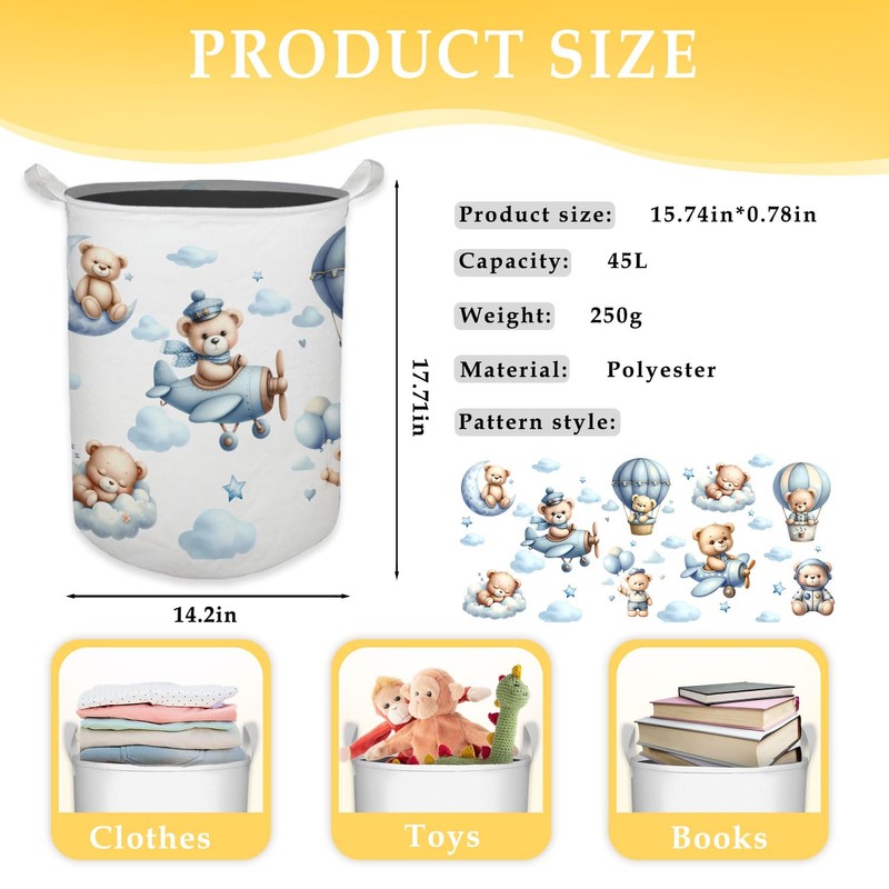 HKTZM Baby Nursery Laundry Basket, Toybox for Boys Girls Room, Cute Blue Bear Laundry Basket Hamper Waterproof Collapsible Clothes Toys Storage Bin Organizer for Kids Room Playroom Bedroom Bathroom