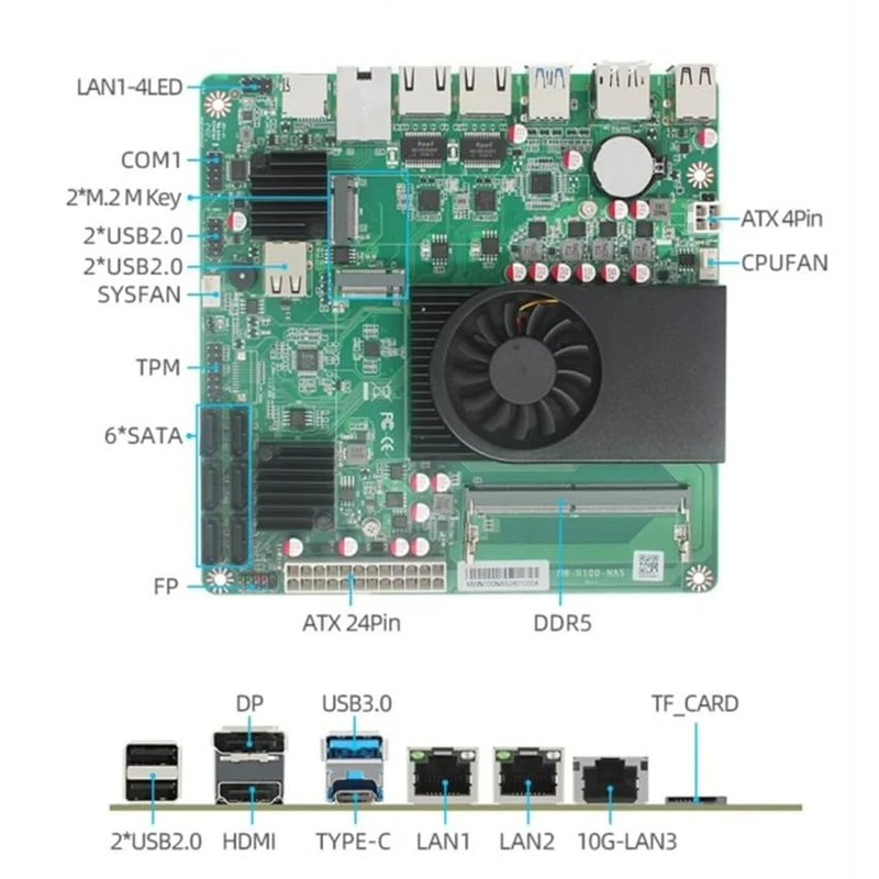 - 【Industrial NAS Motherboard 】Mini-1TX size: 17.0 cm x 17.0 cm,High-density moisture-proof fiber circuit board Ultrafast Connectivity--2* USB3.0, 2* USB2.0, 2* built-in USB on board for for USB booting of the NAS system. 1* HDMI2.1 and 1* DP1.4b to support dual 4K@60Hz display.