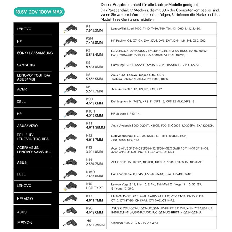 - Universal laptop power supply with 17 plugs also compatible with Asus Vivobook Zenbook, Toshiba Satellite, Lenovo Ideapad ThinkPad Yoga, Samsung Laptop, Sony Laptop, Medion, Acer Aspire charging cable Swift Pavilion TravelMate, Dell XPS Inspiron Vostro, HP EliteBook Spectre Pavilion Envy, JBL Xtreme Xtreme 2, Asus NUC 14Pro NUC14RVH/RVKU5 Ultra5 125H MINI MINI Business Laptop PC 100W Universal Laptop Charger