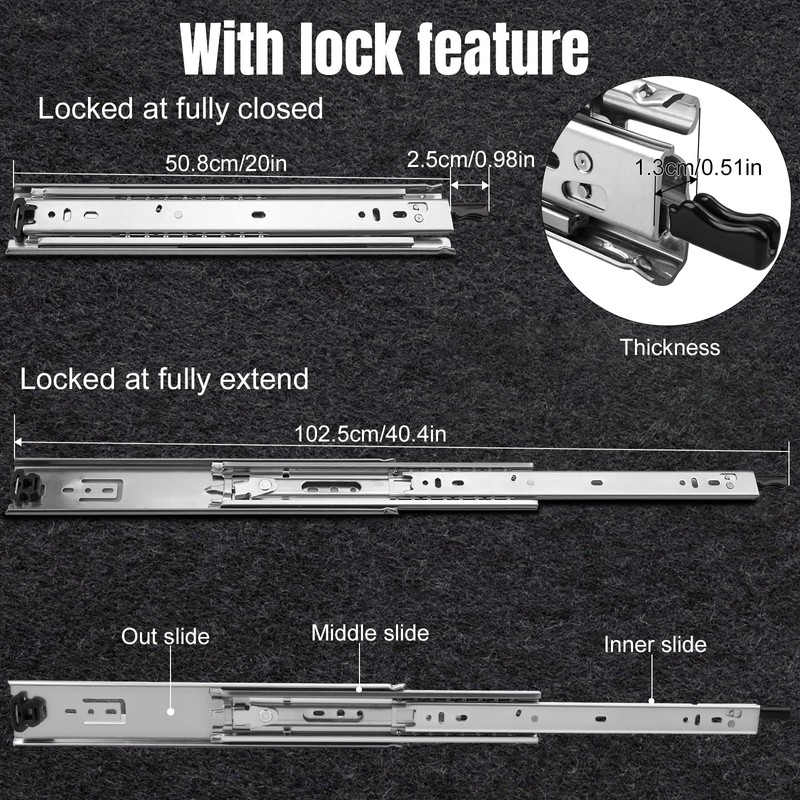 - 【With hold-still lock & Detachable】 There is a black handle to lock-in and lock-out .When it is fully extension or fully closed,the slides will be hold still automatically (in locking state), and no chance of drawer separating from the cabinet.Press the lock handle gently,it's unlocked and get back in free sliding.A double row of ball-bearing action provides a smooth slide performance when closing and opening the drawer.