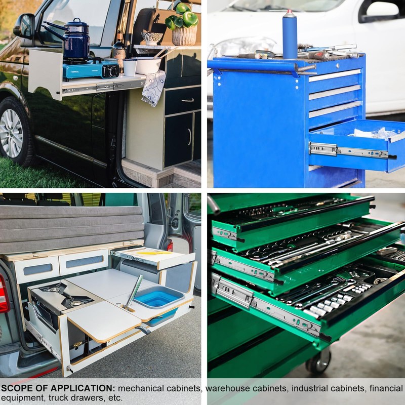 - 【industry and home use】- This heavy duty drawer slides kit is mainly used for Goods shelf, Industrial drawers, Mechanical Cabinets, factory machines, office, vehicle, exhibition drawers, heavy truck drawers, etc. It is perfect for room furniture, industrial drawers, modified car drawers, office cabinets, etc.