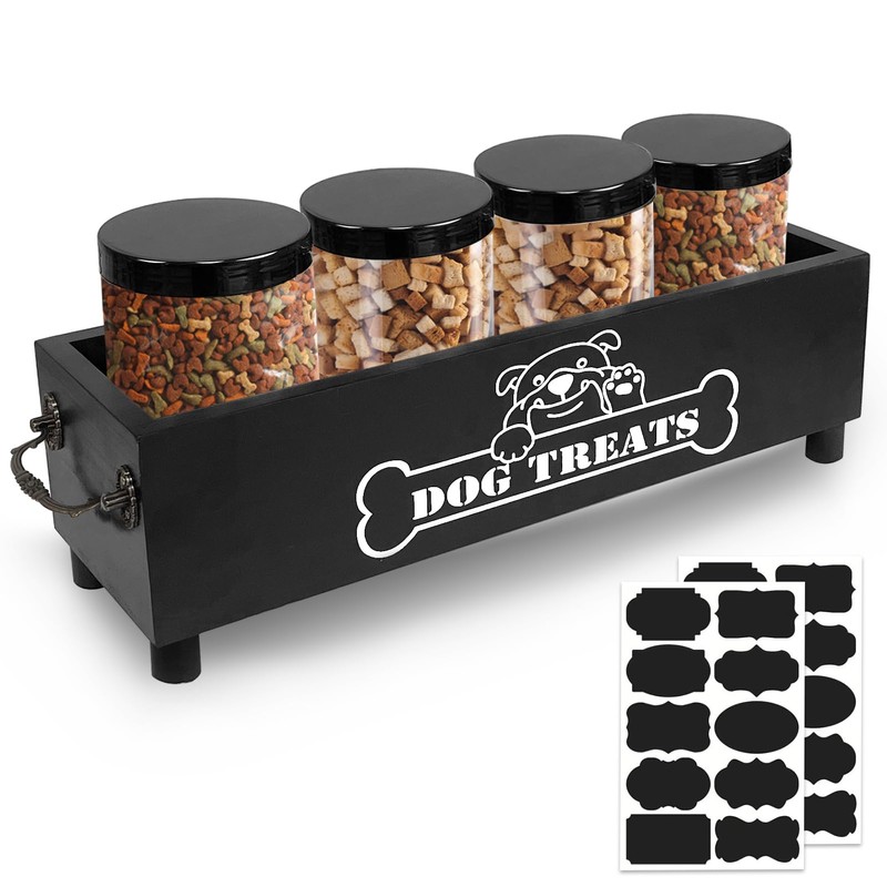 Hlimior Large Dog Treats Container, Dog Cookie Jar for Dogs Cat Treats Container, Farmhouse Wood Pet Treats Storage Organizer for Dog Food Storage Container with 4 Jars, Cat Dog Treat Organizer