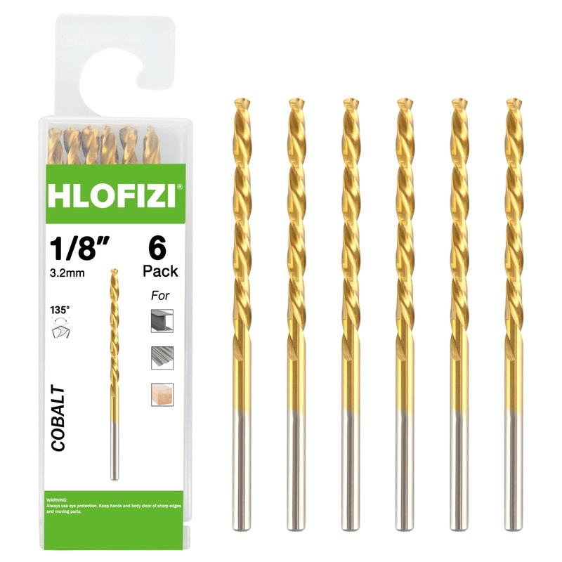 HLOFIZI 1/8" Cobalt Drill Bit (6 Pack), Titanium Twist Drill Bits for Metal, Stainless Steel, Cast Iron and Wood