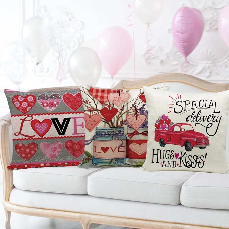 Hlonon Valentines Day Pillow Covers 16x16 Inch Set of 4 - Valentines Decorations Throw Pillow Covers Linen Pillow Case Zippered Square Pillowcase