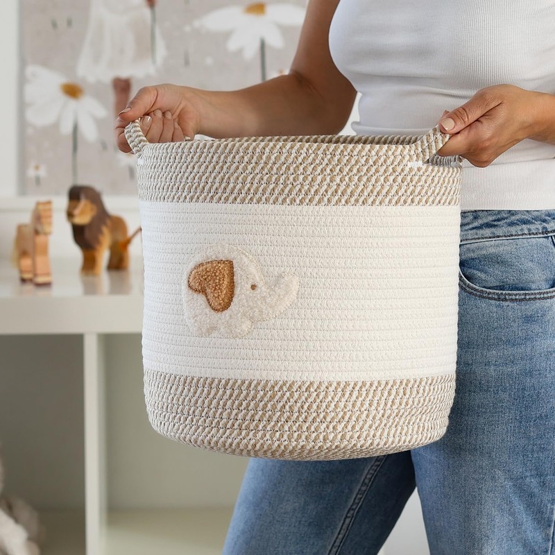 HMF Cotton Nursery Storage Basket with Handles | Elephant | 12" x 12"