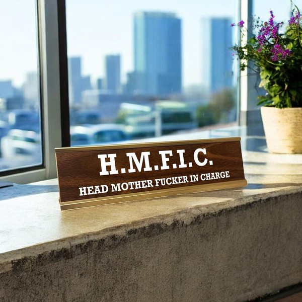 HMFIC Head M-F'ER in Charge Desk Sign - Engraved Plastic on Gold Metal Stand