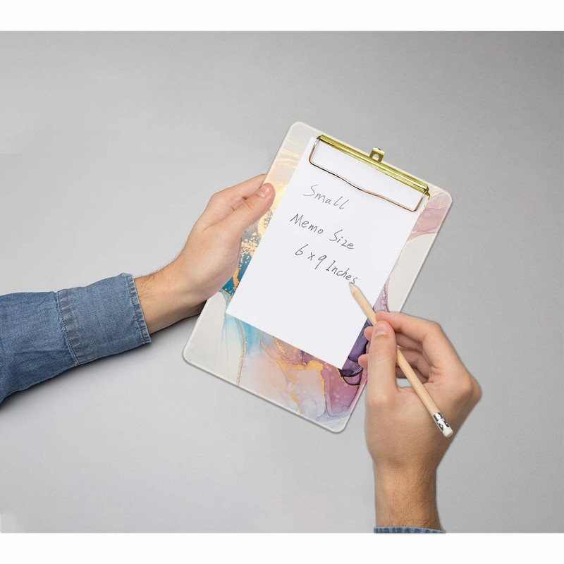 - PERFECT SIZE AND EASY TO USE: Measures 6" x 9"x "0.1" inches (153 x 225 x 25mm), The fashion clipboard can hold standard A5 size papers with ease, and easy to clip on and take off. Perfect for storing your draft papers, artwork, papers, memo, shoping list and more. Designed with Low-Profile Metal Clip, easy to stow away when not needed and fits in most briefcases.