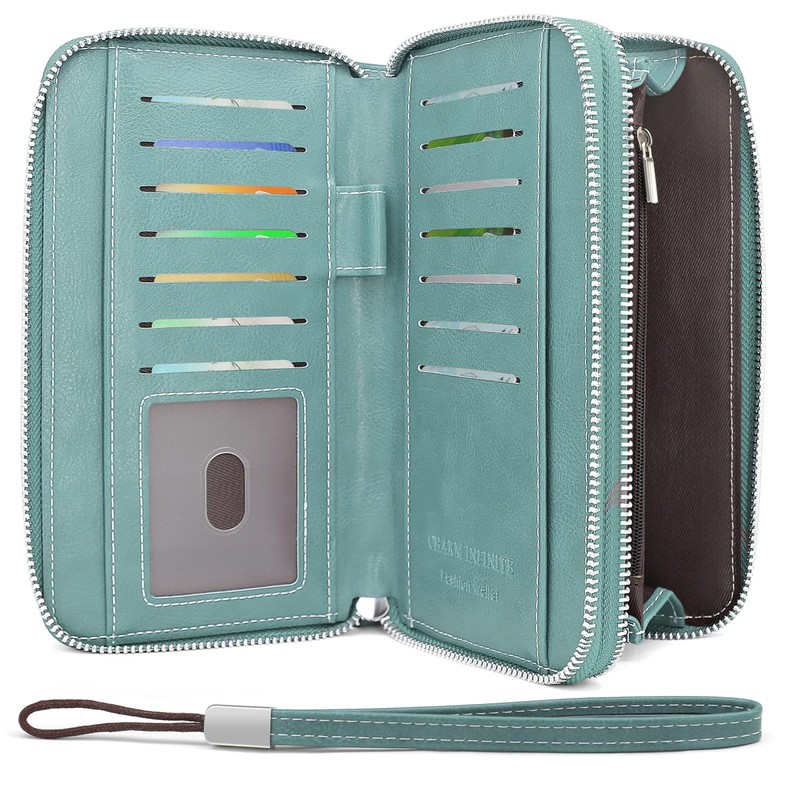 HNOOM Women's Large PU Leather Purse, Many Compartments with 14 Card Slots, Long Wallet, Women's RFID Protection Wallet with Coin Compartment and Removable Hand Strap, lightblue, Minimalist
