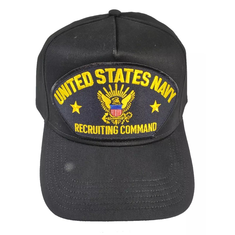 UNITED STATES NAVY RECRUITING COMMAND HAT. (NRC or NAVCRUITCOM) Black Cap High Detail and Impact. 8 Rows Stitching on Visor and Pro Stitch on Crown 5 panel hat. Adjustable Size, Black Golf Style. Great Gift Idea for ANYONE, especially those sailors or commissioned officers recruited by the NRC, or those who worked there. HatnPatch Is THE Veteran Owned Family Business. We Generally Ship Orders Within 24 Hours And Usually The SAME DAY!
