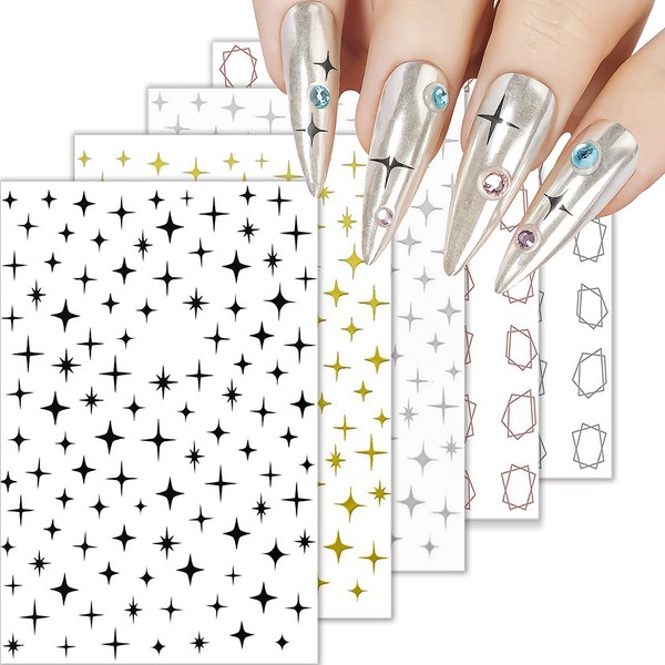 HNUIX Nail Stickers - 3D Star, Self Adhesive Nail Decals, Multi Colour, 8 Sheets, for Nail Art