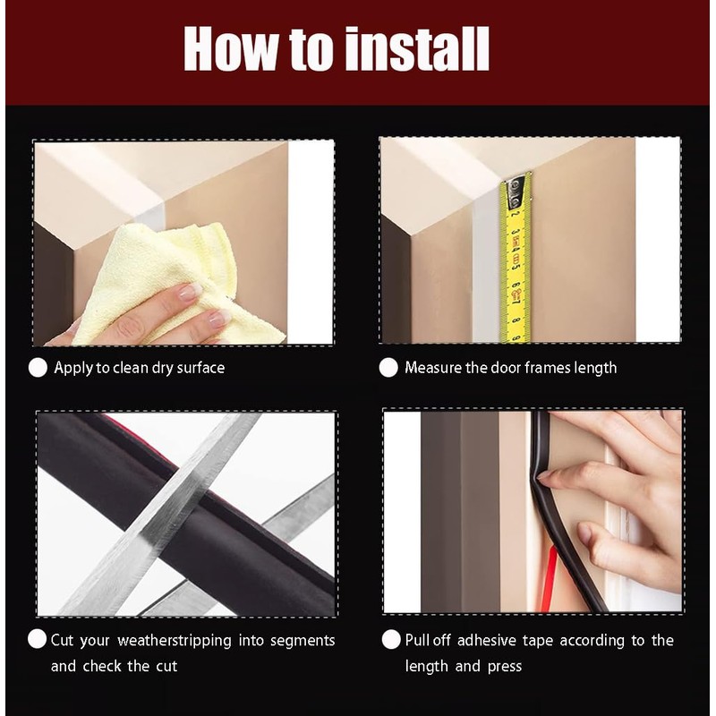 • 【Easy Installation】This door frame seal uses thick semi-solid transparent adhesive, providing strong adhesion. Installation is simple: just peel off the red protective film on the surface. After bonding for 24 hours, the sealing strip will adhere firmly and is unaffected by extreme temperatures. Note: Before applying, clean and dry the surface, and use an adhesion promoter to wipe the door frame surface for optimal bonding effect.