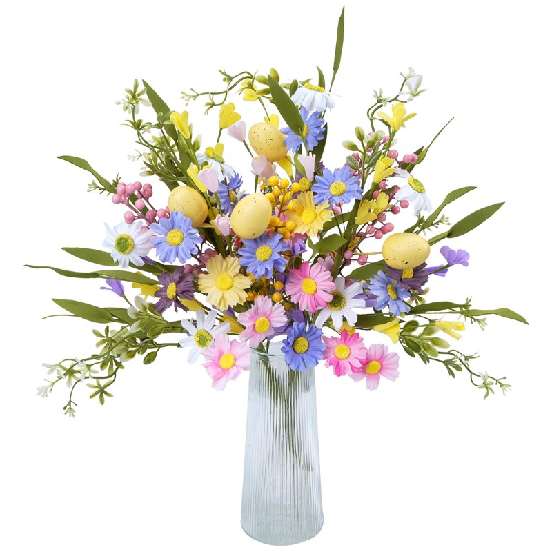 HO2NLE 19.6" Artificial Easter Floral Picks and Sprays Decorations 4 Stems Fake Silk Daisy Easter Flowers with Eggs Faux Floral Arrangements for Table Centerpieces Home Celebration