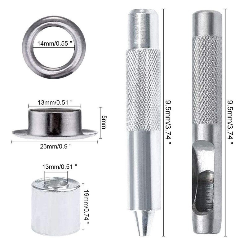 - Package item: tarpaulin eyelets with tool kit includes a hole punch, a matching mandrel and 100 sets of eyelets (each set contains 1 eyelet and 1 eyelet washers) and a storage box.