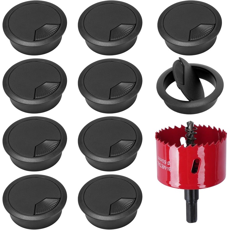HO2NLE Pack of 10 Desk Cable Grommets, 60 mm Cable Pass with 1 Hole Saw, Removable Round Lid for Desks, Table, Office, Worktops, Black
