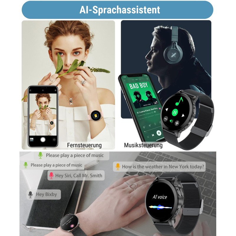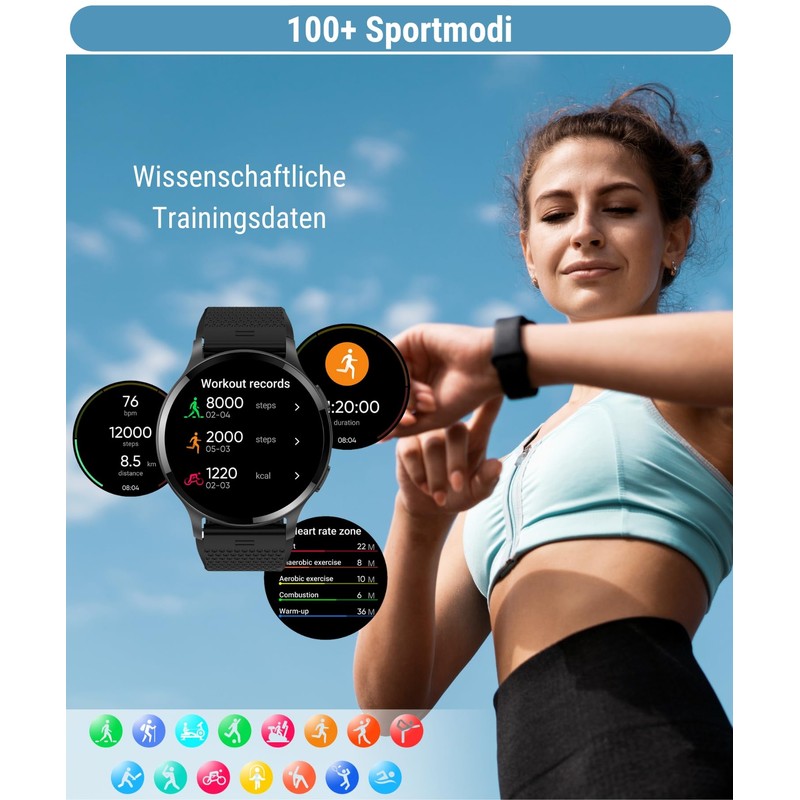 - 【Weitere nützliche Features】 Die Fitnessuhr enthält viele Alltags-Utilities. Wie Bluetooth-Anrufe, intelligente Benachrichtigungen, Atemtraining, Musiksteuerung, Kamerasteuerung, Nicht-Stören-Modus, Stoppuhr, Wetter, Taschenlampe. Bringt Ihnen ein intelligenteres Erlebnis.