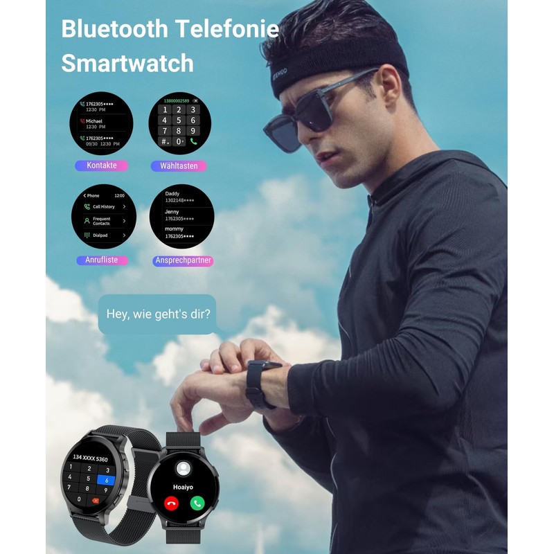 HOAIYO Smartwatch Herren Damen mit Telefonfunktion Rund, 1.45" Fitnessuhr Armbanduhren Sportuhr mit Pulsmesser, Musiksteuerung, Schrittzähler, Kalorien, Wasserdicht Fitness Tracker
