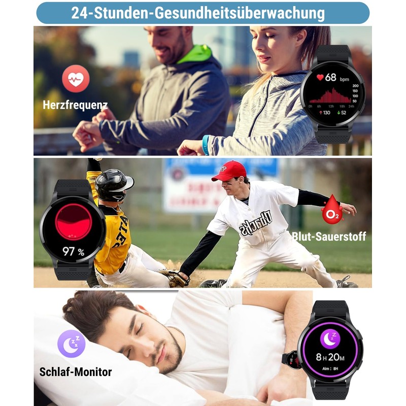 - 【24-Stunden-Gesundheitsüberwachung】 Eingebaute Hochleistungssensoren überwachen Ihre Herzfrequenz, Ihren Schlaf, Ihren Blutsauerstoff und Ihren Blutdruck rund um die Uhr, und Sie können tägliche Daten und zusammenfassende Statistiken auf Ihrer Uhr oder App deutlich sehen. Ermöglicht es Ihnen, Ihren Lebensstil und Ihr Trainingsprogramm rechtzeitig anzupassen