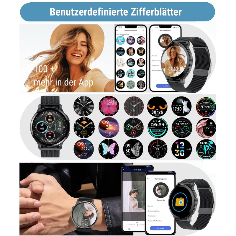- 【Personalisierte Zifferblätter】 Sie können aus mehr als 100+ Smartwatch-Zifferblättern auswählen. Darüber hinaus können Sie Ihre Lieblingsbilder verwenden, um Ihre eigenen Zifferblätter zu erstellen. Sie können die Zifferblätter verschiedener Stile entsprechend verschiedenen Szenen ändern