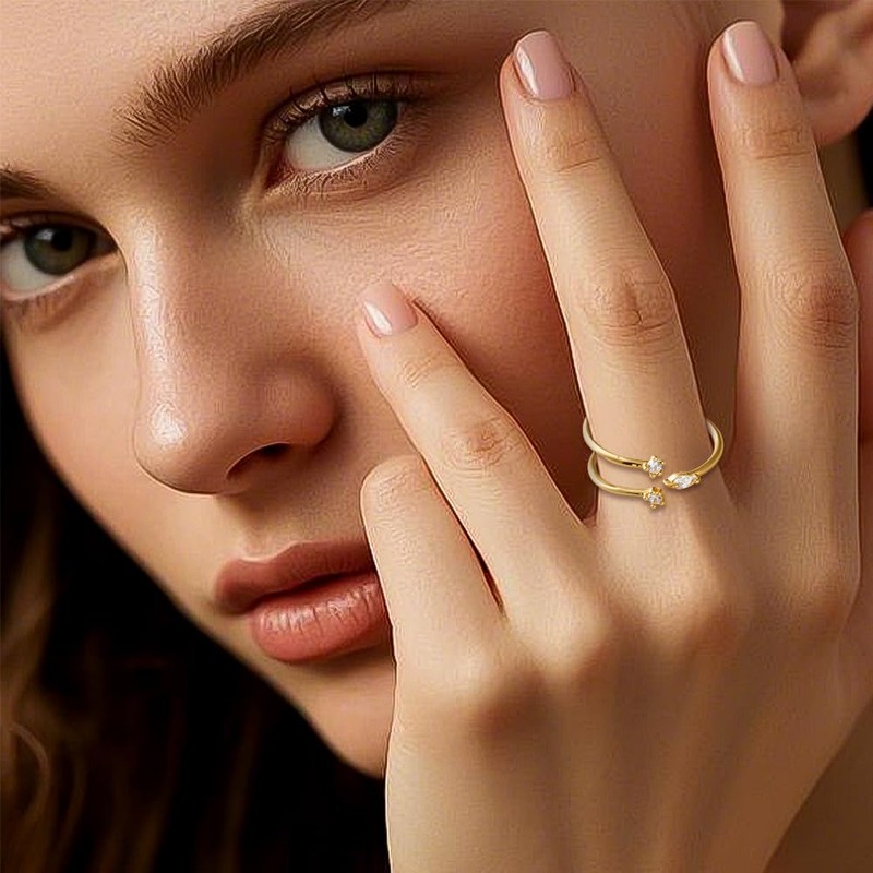 - Double-Layered Design: This gold and silver two-tone brass ring features an innovative two-tiered construction design with sparkling rhinestones on the top and bottom, creating a layered visual effect that showcases the ornate details while maintaining the overall simplicity of the ring.