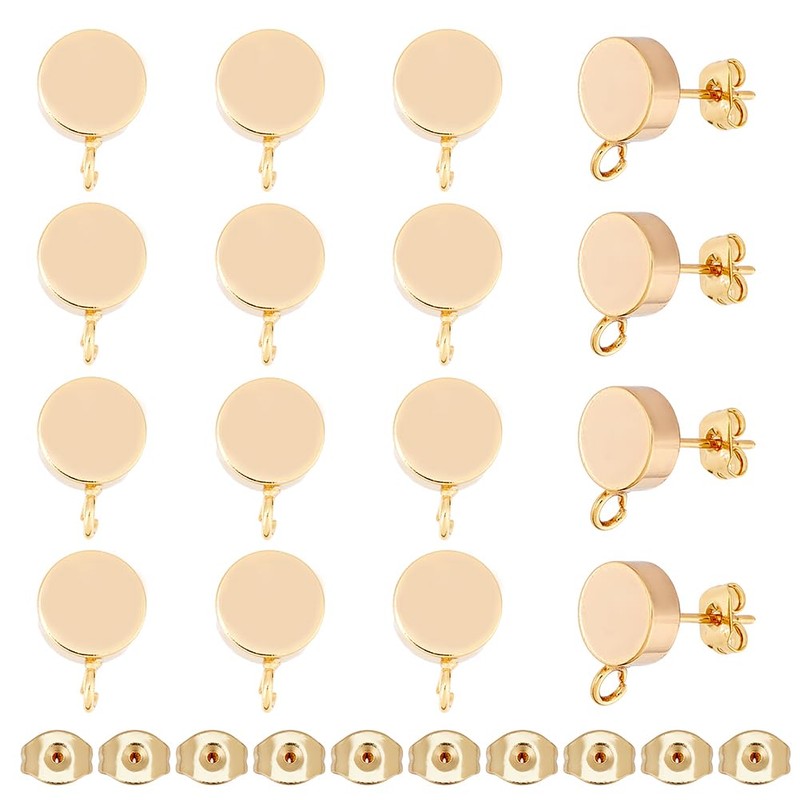 Hobbspring 30Pcs Flat Round Earring Posts 8mm 18K Gold Plated Stud Earrings with Loop Brass Stud Earring Findings with 30Pcs Butterfly Ear Back for DIY Jewelry Dangle Earring Making