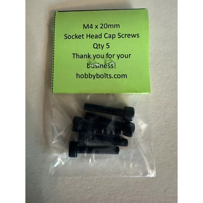 M4x20mm socket head cap screw. Packaged in quantities of 5pcs per pack. These socket head cap screws are perfect for the radio-controlled hobby and other hobbies. hobbybolts.com