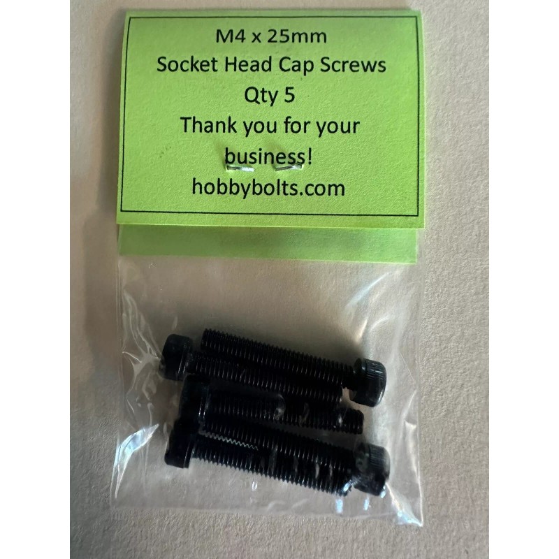 M4x25mm socket head cap screws, packaged in quantities of 5pcs per pack. These socket head cap screws are perfect for your radio-controlled hobby and many other hobbies needs. hobbybolts.com