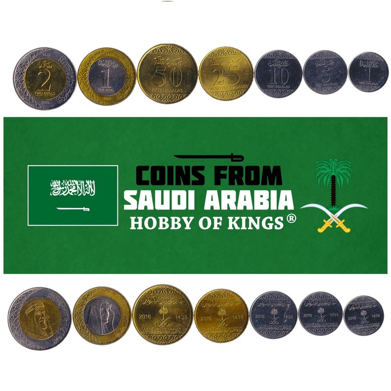 7 Coin Set from Saudi Arabia also known as (Kingdom of Saudi Arabia, ???????????? ????????????? ???????????????). Denominations: 1 Halala 5 10 25 50 Halalas 1 Riyal 2 Riyals. Each product may have different years, picked from the numismatic period: 2016. Coins will be picked from these KM numbers: 73, 74, 75, 76, 77, 78, 79. This coin collection includes real pieces and has famous symbols, portraits, buildings or animals: Palm Tree, Sword