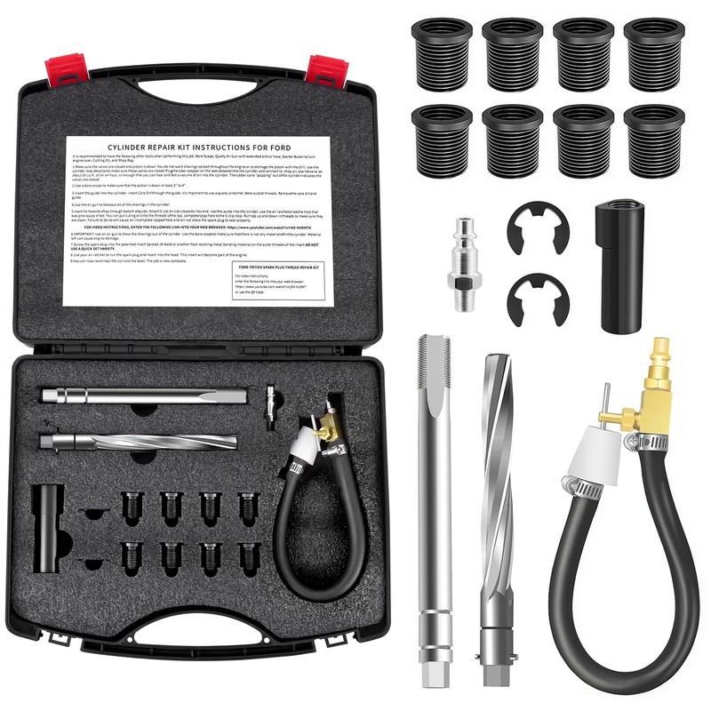 - đăProfessional KităThis thread repair kit is designed to repair two valve modular cylinders heads, address a regularly occurs damaged heads from blown spark plugs, Our spark plug repair kit including the M14-1.25 steel alloy insert*8, Twist Drill, Screw Tap, Line up Guide, Cylinder Leak Tester