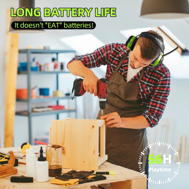 - [56H Playtime & NRR 25dB] Our ear protection has long battery life (NOT EAT BATTERIES) and offers an NRR 25dB and SNR 30dB rating, certified by ANSI S3.19 (US) & CE EN 352-1(EU) for blocking out loud noise to harm your ears. The comfortable earpads and adjustable headband can accompany you all day without headaches. They are very suitable for mowing grass, gardens, snow blowers, and woodworking, and let the wonderful radio accompany you on your workday