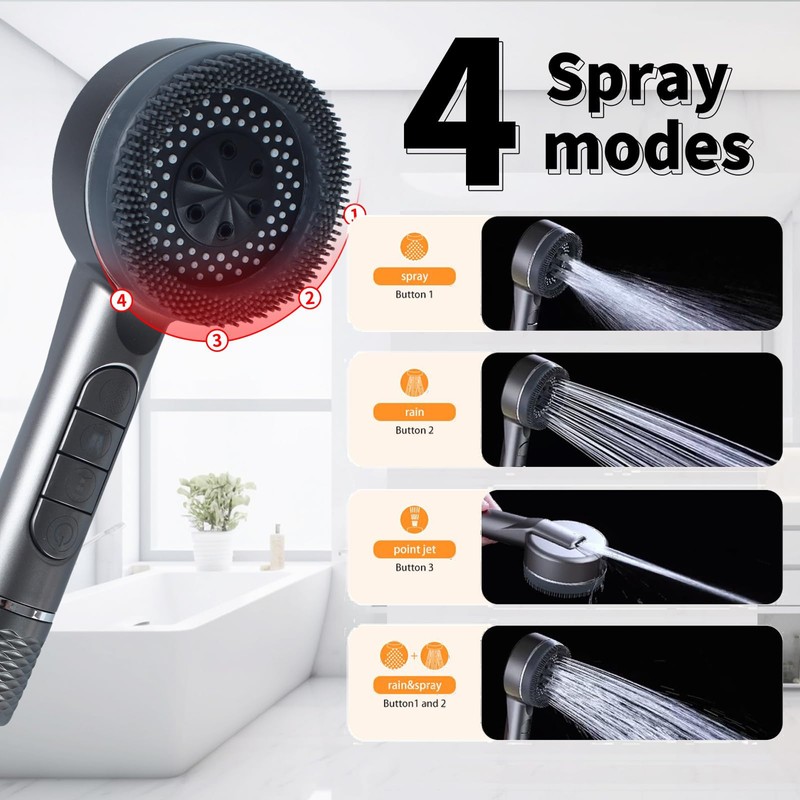 - 【3+1 Spray Modes Shower Filter】 This shower head and hose has 4 spray modes, You can enjoy 4 modes simply by pressing the corresponding buttons.including rainfall, spray, mixed modes and the super powerful cleaning jet. The spray mode provides a soft, gentle mist-like water flow which feels like soft cotton, perfect for relaxing and relieving muscle tension. The shower head to turn it into high-pressure power cleaning mode. Easily and instantly rinse away foam, hair and dirt from the bathroom, creating a better shower environment.