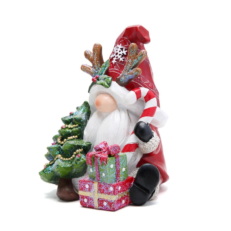 - Festive Holiday Gnome Decor: Elevate your holiday spirits with our 6"H Christmas Gnome. This resin gnome boasts a delightful red hat intricately carved with snowflakes, holly leaves, and charming antlers. He holds a mini Christmas tree in one hand and a candy cane in the other. Two beautifully wrapped presents sit at his feet. This adorable gnome is the ultimate Christmas decor addition, spreading holiday cheer and anticipation!