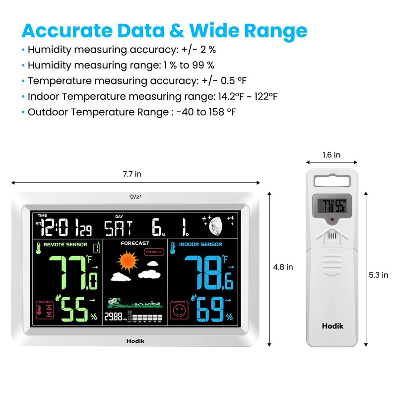 - Weather Station Indoor Outdoor Thermometer Wireless with 7.6 inch DisplayLarger, clearer screen viewing angles, comfortable color, indoor outdoor temperature (C/F), inside outside humidity, barometric pressure, moon phase, calendar, atomic clock, weather forecast and trend, daily MAX/MIN data.