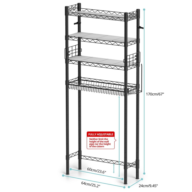 - 【Adjustable and Strong Compatibility】The order and spacing of shelves/baskets can be adjusted, as well as the height of bottom stabilizer bars, that means you can assemble the first shelf/basket and the bottom long stabilizer bar according to the height of your wall water pipe and tank.