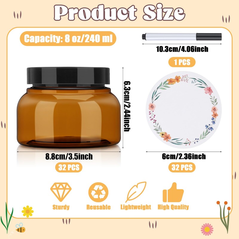 - Package Includes: You will get a total of 32 pcs 8 oz amber plastic body butter jars with lids in this package, providing ample storage space for your various products.You will also get 1 erasable marker pen , 32 round labels. These round plastic jars with lids are perfect for packaging body butter, lotions, creams, sugar scrubs, candy, bath salts, and more.