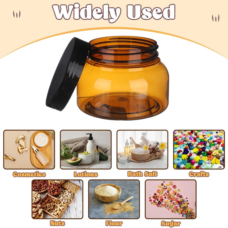 - Versatile Design: With a sleek and elegant design, the plastic jar bottle is amber and the cap is black,these 8 oz plastic jars with lids can be used for a variety of purposes, from cosmetics and beauty products to home decor and party favors. The stackable design of these body butter jars allows for easy storage and organization. They are perfect for keeping your products neat and tidy on a vanity, dresser, or shelf.