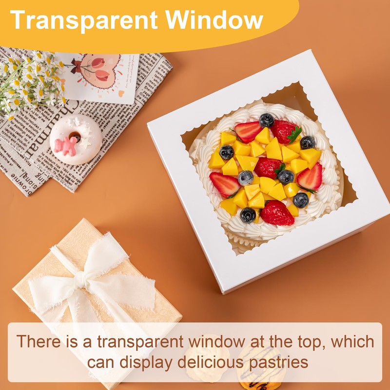 - Cake Boxes with Window: The top of the cake storage container has a transparent window that allows you to cake display. The white square cake box gives your handmade cake an elegant and exquisite appearance, making it a perfect cake decorating for DIY cakes at home. If you open a cake box store, you can also use our tall cake box, which look very professional when you hand the cake to the customer.