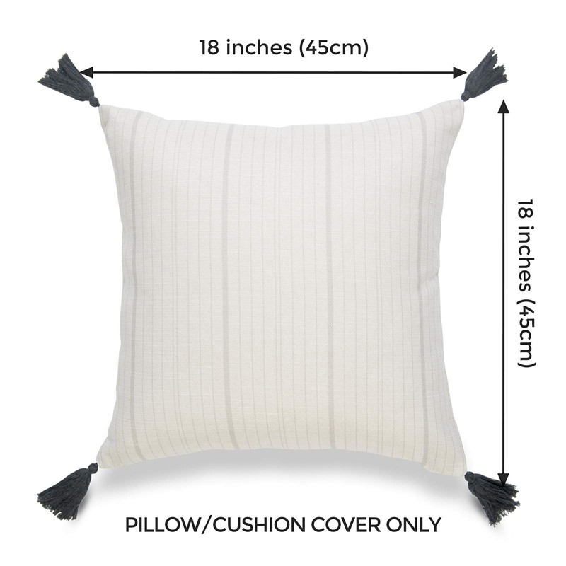 - FEATURES: THROW PILLOW COVER; SOLD AS 1 PIECE; Dimension:18"x18" (45x45cm); Same pattern on front and back; Invisible zipper on bottom; With playful tassels; Faux linen fabric;