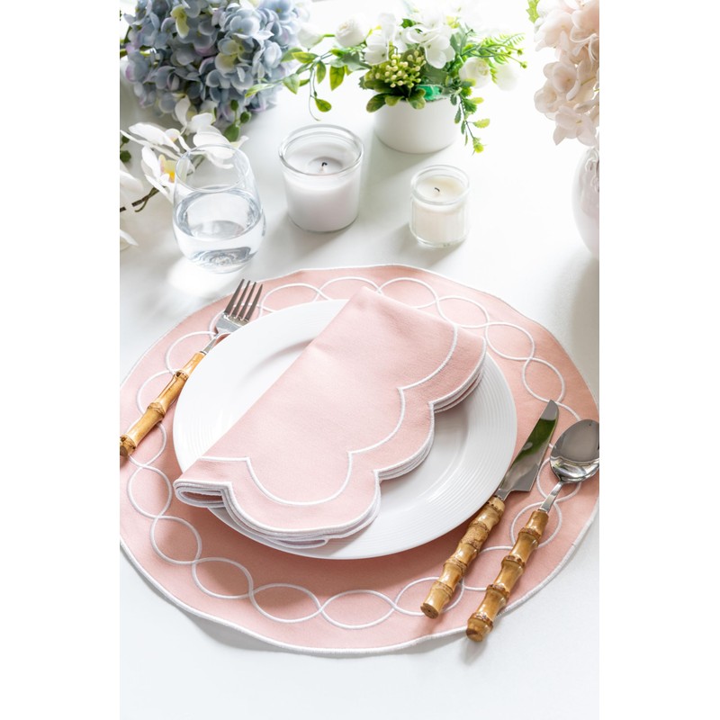 - Refined Coastal Design: With intricate white embroidery on a blush pink base, complemented by a scalloped border, this napkin brings a fresh, coastal charm to your dining setup. The white reverse side adds to its clean, elegant appeal.